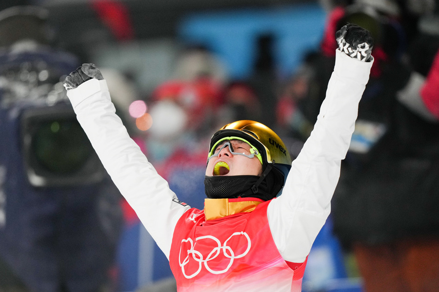 2月16日,齐广璞完成动作后庆祝。新华社记者 薛玉斌 摄
