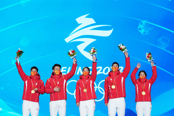 武大靖(右二)和队友获得本届冬奥会中国代表团首枚奖牌 图据新华社