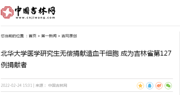 TOP2:北华大学医学研究生无偿捐献造血干细胞 成为吉林省第127例捐献者