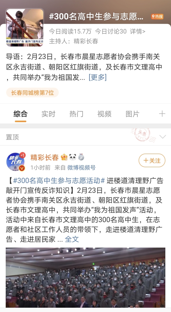 2月23日,长春市晨星志愿者协会携手南关区永吉街道、朝阳区红旗街道,及长春市文理高中,共同举办“我为祖国发声”活动,活动中来自长春市文理高中的300名高中生,在志愿者和社区工作人员的带领下,走进楼道清理野广告、走进居民家进行防诈骗宣传。