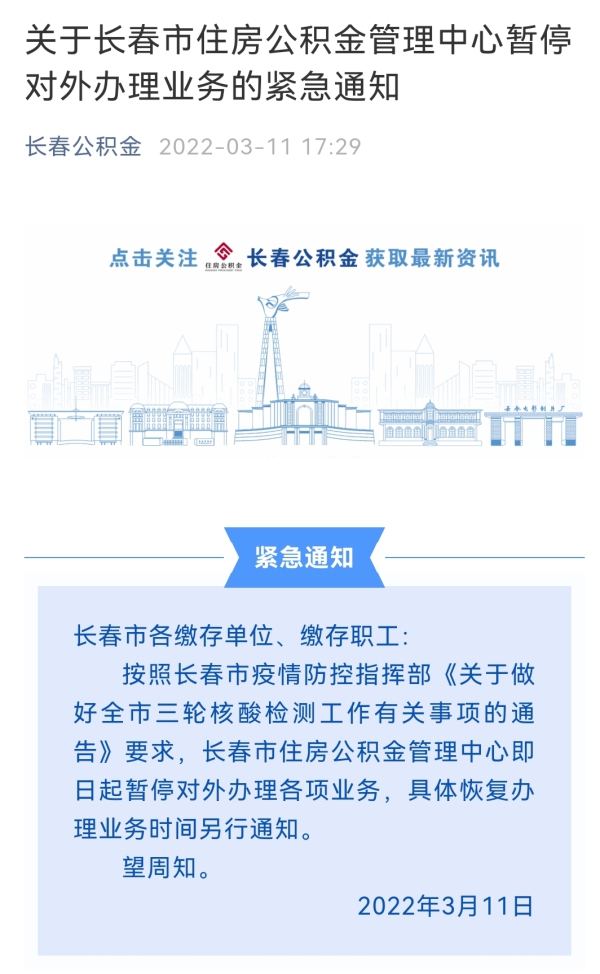 中国吉林网获悉,按照长春市疫情防控指挥部《关于做好全市三轮核酸检测工作有关事项的通告》要求,长春市住房公积金管理中心即日起暂停对外办理各项业务。