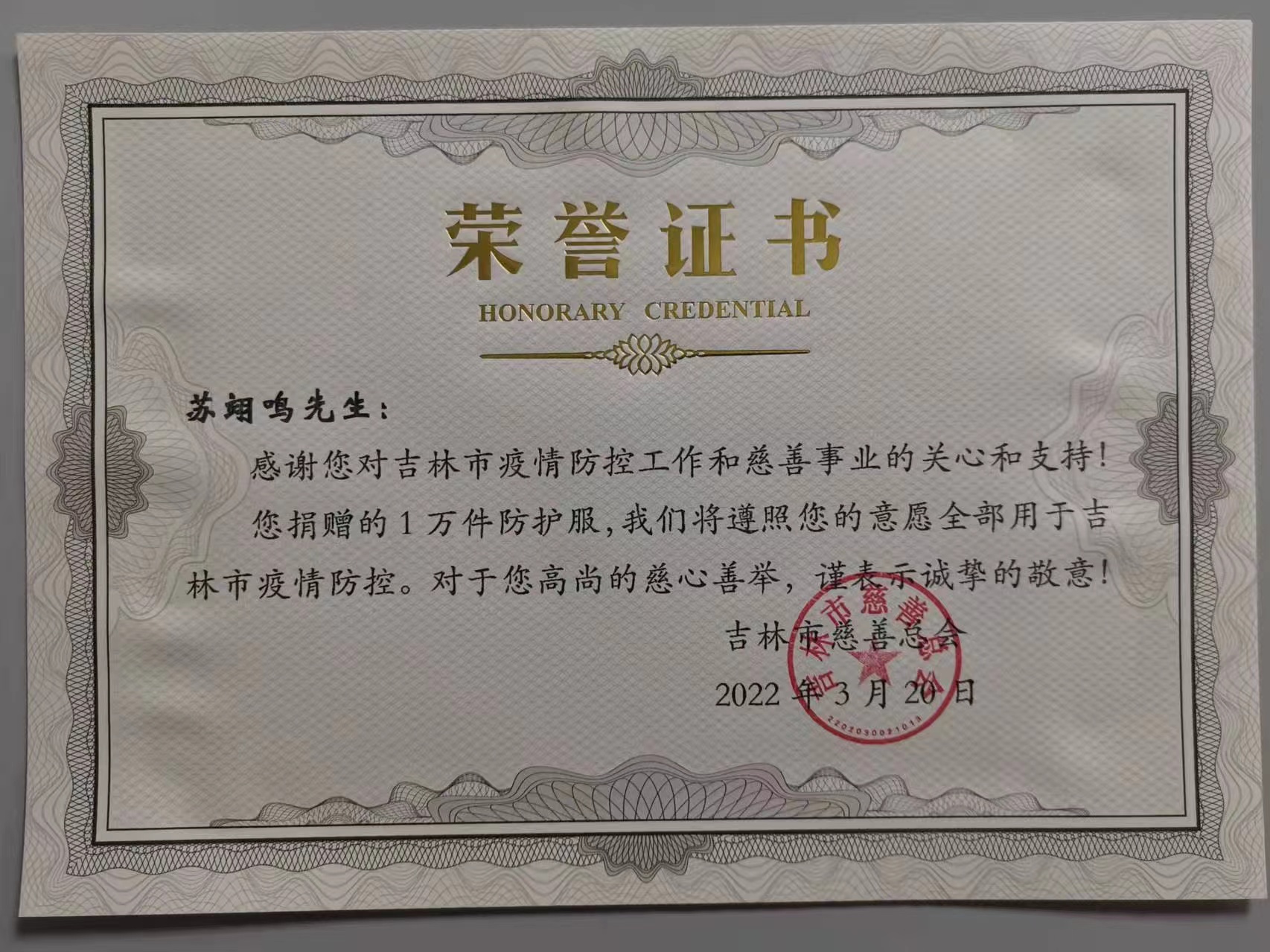 3月20日,本届冬奥会单板冠军——吉林市籍滑雪运动员苏翊鸣向家乡捐赠10000套防护服。