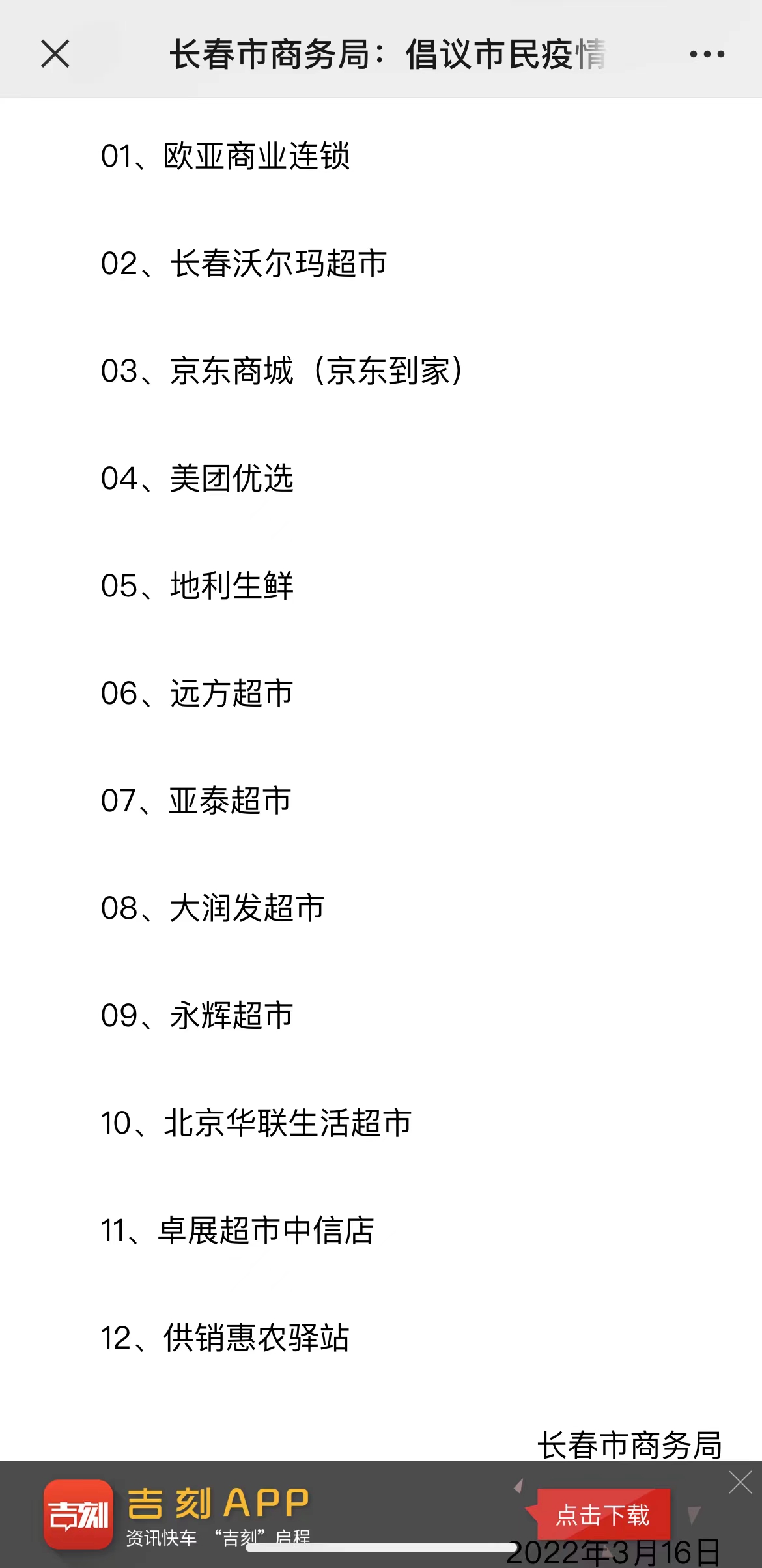 中国吉林网:记者从长春市商务局获悉,目前长春开通了线上购物平台,欧亚商业连锁,长春沃尔玛超市,京东商城(京东到家),美团优选,地利生鲜,远方超市,亚泰超市,大润发超市,永辉超市,北京华联生活超市,卓展超市中信店,供销惠农驿站等均可线上下单购买。