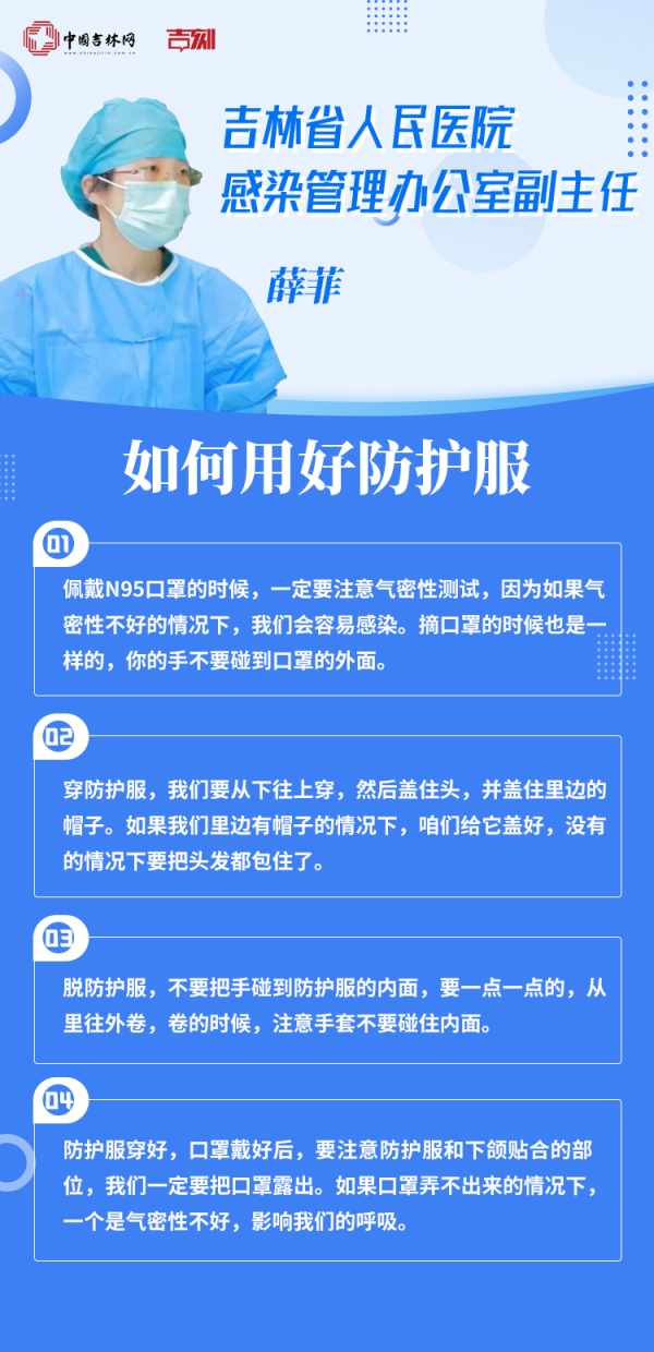 我们的抗疫工作者,他们在平常穿脱防护服的时候,有一些什么需要注意的?对于这样的问题,吉林省人民医院感染管理办公室副主任薛菲从专业角度来告诉我们,如何用好防护服。