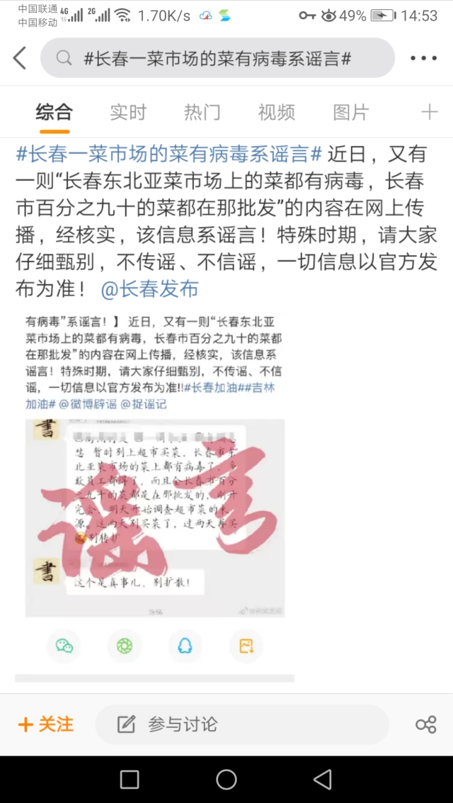 今日,官方再次辟谣:网传长春市一菜市场的蔬菜有病毒。这,还是一个假消息。