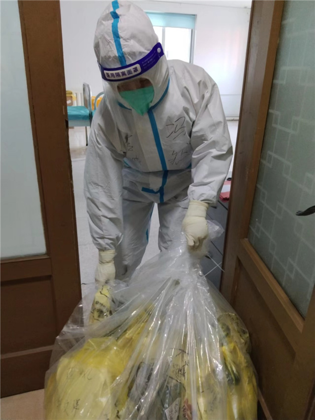 刚开始,领队安排我在病房接收患者,可能是看到我比较认真,又把我调整到更加重要的岗位——作为逆行者对环境进行消杀。这个岗位的重要性在于它肩负着所有队员乃至整个疗区的安全,主要工作内容包括清理打包脱区的废弃防护物资,还要做好环境的消杀工作,也会负责消杀患者的随身物品,是保证无感染至关重要的一环。因为是身处污染区,所以被称为“逆行消杀”。