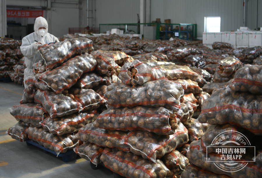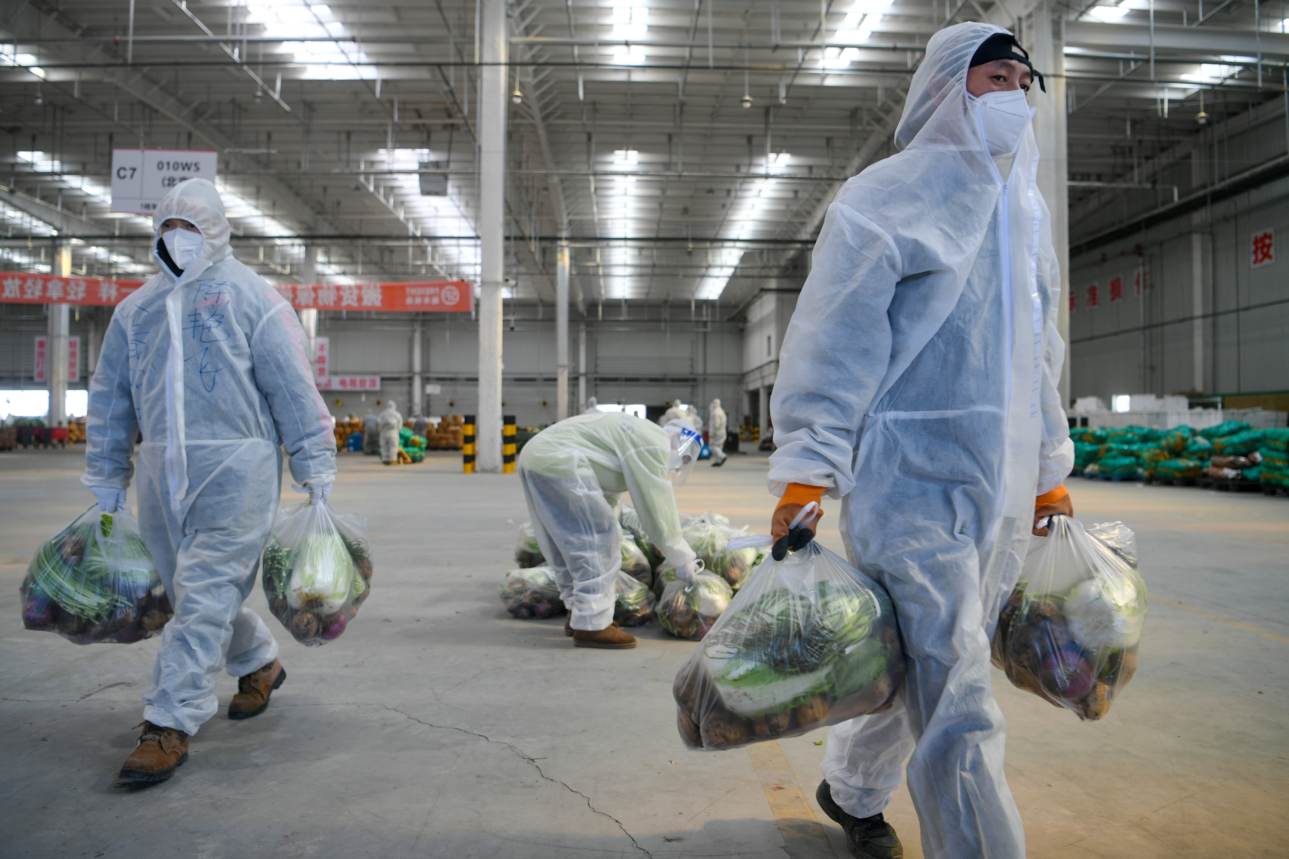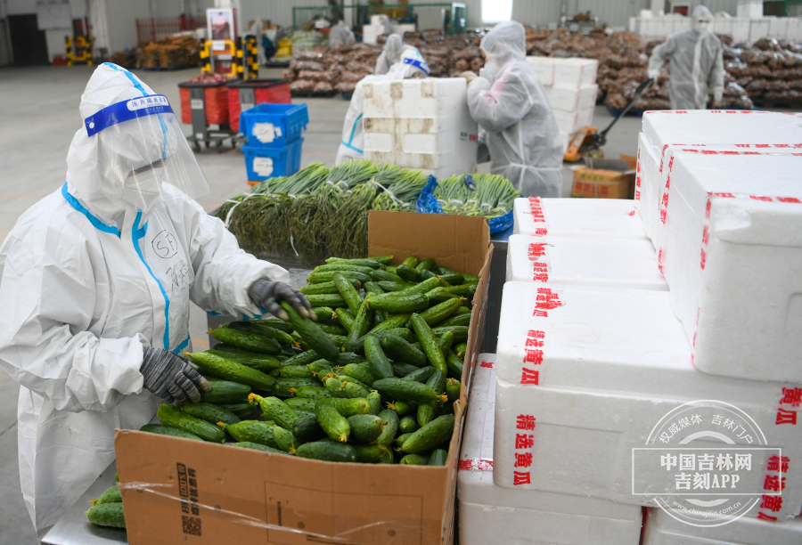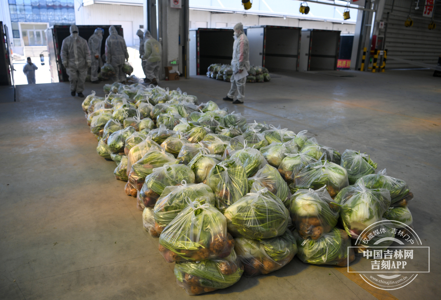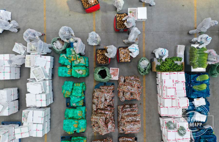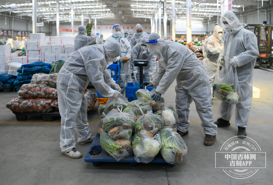 穿着防护服的分拣员熟练地进行着分拣工作。土豆、白菜、芹菜、蒜薹、圆葱……一份份蔬菜包就这样诞生了。