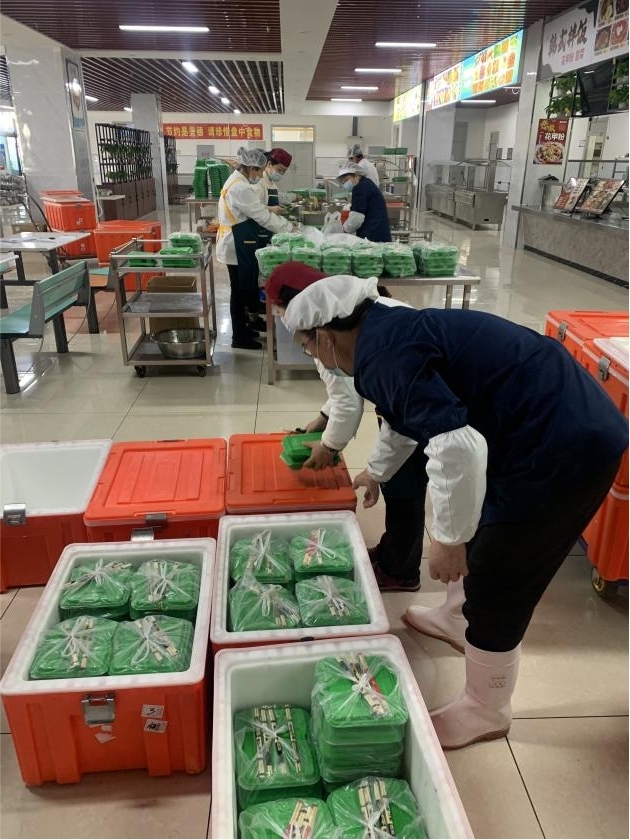 四是加强后勤统筹,保障服务师生更加有心。学校按照长春市疫情防控学校专班文件要求,暂停校内堂食就餐。后勤处立即启动紧急预案,承担起饭菜果蔬供应和服务保障任务。后勤处连夜组织协调,敲定食材物资供应项目和数量,做好充分的物资储备。为了丰富饮食种类,除了常规盒饭,后勤处充分调动现有资源,为在校学生提供了个性化订餐服务,其中还包括民族特色餐,满足了大家多样的需求。由于此前没有过如此大量的配送供应经验,给配餐无形增加了很大困难,在刚开始磨合阶段,后勤处餐饮相关工作人员白天黑夜连轴工作,按照学工部门统计出来的用餐需求,按时准备好,并配送到学生宿舍门口,志愿者再将饭菜配送到对应寝室,一切只为保障大家的一日三餐。为了增加营养,学校为学生免费发放香蕉、苹果、橘子等新鲜水果,同时协调超市保障供应每天学生日常生活用品。为了保证校园环境整洁以及维修、维护,物业安排保洁人员和维修工作人员留守学校。他们吃住在校,默默付出,尤其是目前学生在寝室就餐,产生了远多于平常的生活垃圾,值守的保洁人员只能连续工作以保证宿舍环境及卫生安全。由于校医院隔离区域紧张,5名在校维修工人经过两天的紧张施工,完成宿舍隔离区域改造任务。在校师生每天能有温暖的饮食、整洁的环境,正是他们的付出,保障了服务师生更加有心。