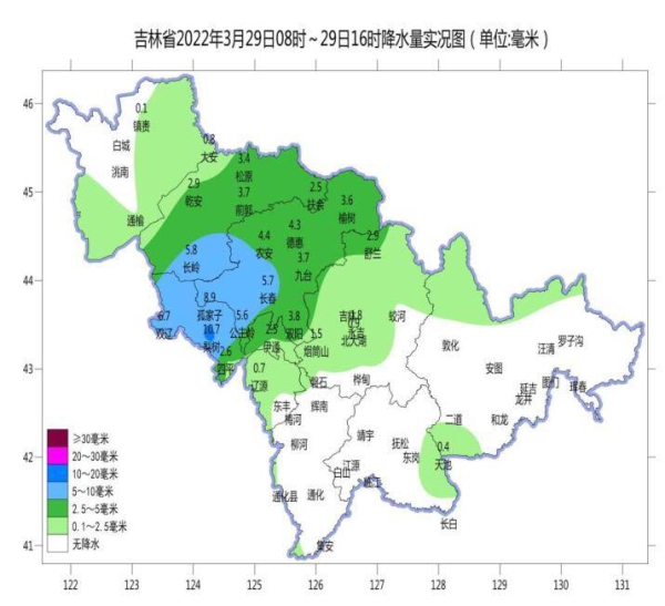 受高空槽及地面低压影响,3月29日白天开始,吉林省中西部出现雨或雨夹雪。截至29日16时,全省平均降水量1.6毫米,地区分布:四平6.3毫米,长春4.4毫米,松原3.7毫米,吉林0.9毫米,辽源0.4毫米,白城0.2毫米,其他地区暂无降水。