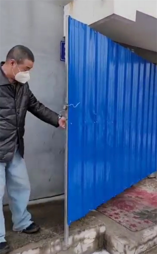 其实,单元门并未焊死,工作人员是在围栏一侧焊了一个轴,另一侧用铁丝勾挂。