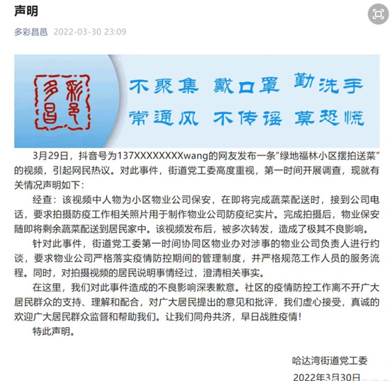 中国吉林网从吉林市“多彩昌邑”公众号了解到,经查:该视频中人物为小区物业公司保安,在即将完成蔬菜配送时,接到公司电话,要求拍摄防疫工作相关照片用于制作物业公司防疫纪实片。完成拍摄后,物业保安随即将剩余蔬菜配送到居民家中。该视频发布后,被多次转发,造成了极其不良影响。