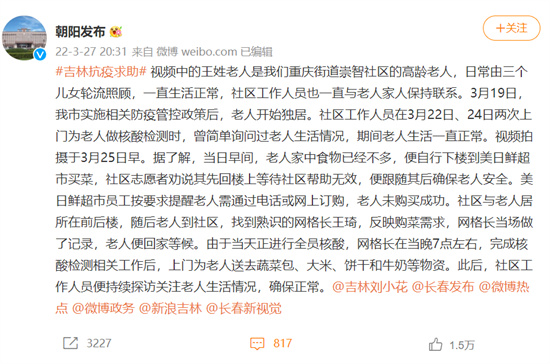据@朝阳发布通报,视频中的王姓老人是重庆街道崇智社区的高龄老人,日常由三个儿女轮流照顾,一直生活正常,社区工作人员也一直与老人家人保持联系。