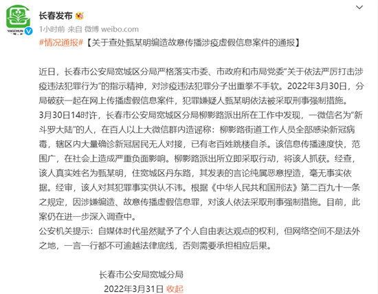 无独有偶,长春市市民马某财故意编造、传播涉疫虚假信息被警方通报!