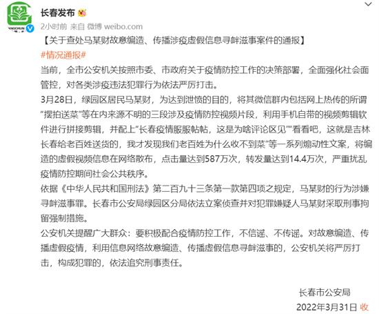 3月28日,绿园区居民马某财,为达到泄愤的目的,将其微信群内包括网上热传的所谓“摆拍送菜”等在内来源不明的三段涉及疫情防控视频片段,利用手机自带的视频剪辑软件进行拼接剪辑,并配上“长春疫情服服帖帖,这是为啥评论区见”“看看吧,这就是吉林长春给老百姓送货的,我才发现我们老百姓为什么收不到菜”等一系列煽动性文案,将编造的虚假视频信息在网络散布,点击量达到587万次,转发量达到14.4万次,严重扰乱疫情防控期间社会公共秩序。