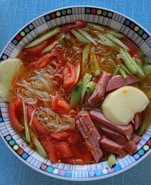 记者所在的小区提供的蔬菜包,来自梅河口,蔬菜包里有2~4袋冷面,最近一段时间,冷面成了社区群的“网红”,邻居纷纷晒出了冷面的各种吃法。除了冷面包中的调料和汤汁外,还可以煮一个鸡蛋,切几片苹果,加一点番茄、香菜、黄瓜,家里的物资可以物尽其用地放在里面,改善一些生活。