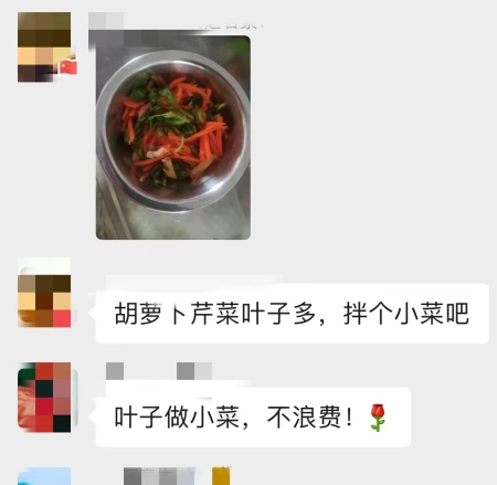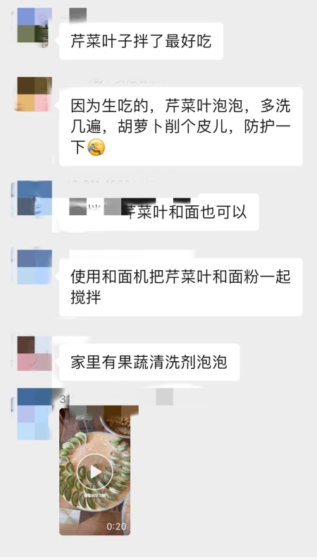 在晒了一圈冷面后,又有邻居在群里教年轻人如何储存蔬菜。比如可以把番茄等容易坏的蔬果加热煮熟,然后切成小丁冻在冰箱中,需要吃的时候取一小块解冻即可,味道不变,营养也不会流失。小区里年长的邻居开始教年轻人如何把不太新鲜的蔬菜,会被扔掉的芹菜叶等食材制作成凉菜、咸菜,不但可以继续食用,还可以解馋。