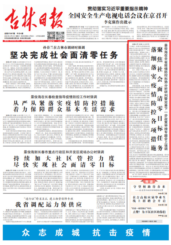 据《吉林日报》报道:4月1日晚上,省委书记景俊海以视频形式主持召开全省疫情防控形势分析研判暨完善下一步政策举措专题会。他强调,要尽快恢复基本生活物资市场供应体系,对保供人员实行闭环管理、高频检测,确保供应配送链条绝对安全,切实做到关门不关店、线上能订货、线下能送达。