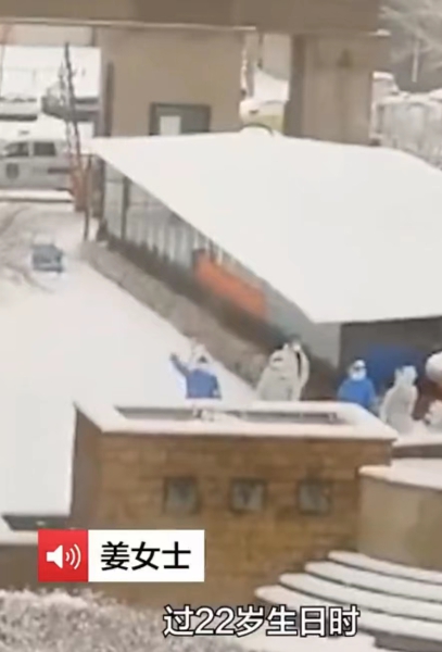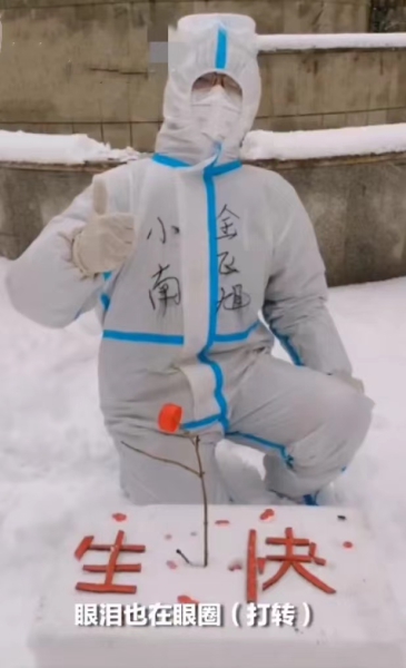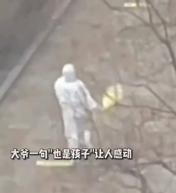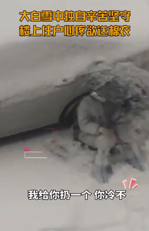心疼“大白”的又何止这个孩子。近日,一位在家中隔离的网友,看到门口有一位“大白”在雪中撑着伞值守,天气寒冷,“大白”冷得缩成一团,这位网友喊:“孩子,我家有棉袄,我给你扔下去吧!”被大白婉拒,场面让人心疼。