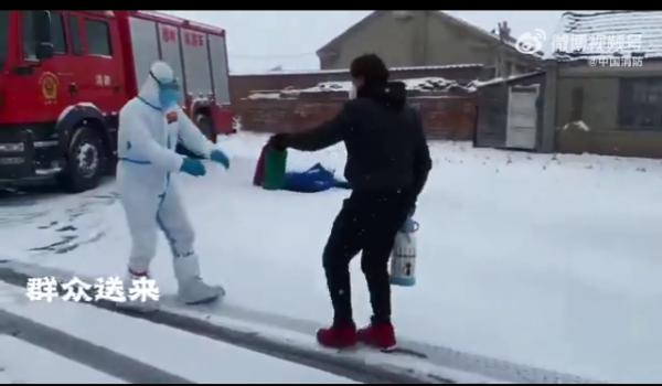 3月中旬,在冰天雪地坚守多天的消防员,在给居民做核酸时,收到了群众送来的暖水袋、热水壶,小朋友暖心的招手和微笑……