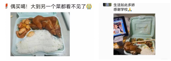 “农大的伙食真棒!”“感谢学校!”“猪蹄好好吃啊!”……4月10日,收到学校食堂送来的装着红烧猪蹄的惊喜盲盒,植物保护学院的祝月同学和许多同学一起在朋友圈开心表白学校。“学生们不容易,都封闭一个月了,我们再辛苦再累,也要让他们吃饱吃好。”面容憔悴的食堂管理人员李鹏说。