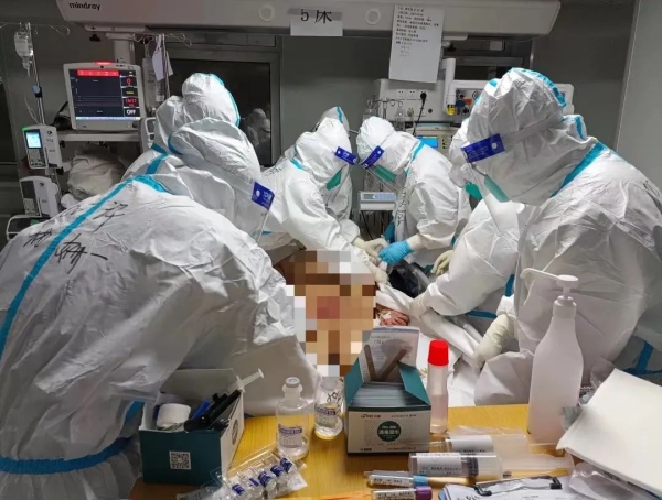 疗区有一位老年患者入院前心肺功能不佳,感染了新冠病毒后病情更为严重,在高流量氧疗下患者的呼吸功能及生命体征未得到改善。发现情况后我迅速报告值班医生,立即为其紧急进行气管插管、呼吸机辅助呼吸、ECMO治疗等抢救措施。因患者意识处于镇静状态,我们不但要负责他的病情观察,还要负责生活上的护理。由于患者肺部感染严重,有大量痰液,需要随时吸痰保持气道通畅,并且要定时做好口腔护理和尿道口护理防止感染,还要随时检查各管路的通畅情况。为了改善他的肺功能,我们为他采取俯卧位通气,并定时为患者改变体位,保证患者的舒适度和皮肤的完整。俯卧位翻身再加上患者身上的ECMO管路、胃管、气管插管、创动脉留置管、中心静脉导管、尿管等管路,所以为他翻身难度增大,每一次我们都需要至少六到八名护士配合完成。除此之外,不定时的采血、输液、根据病情的进展随时调整用药剂量......疗区的重症患者或是昏迷,或是生活不能自理,在护理时我们无法正常与之交流,但作为护理人我们严格落实操作规范,认真地亲人般地对待每一位患者,竭尽全力做好每一项护理工作,希望在我们的精心照护之下,患者能早日恢复健康。