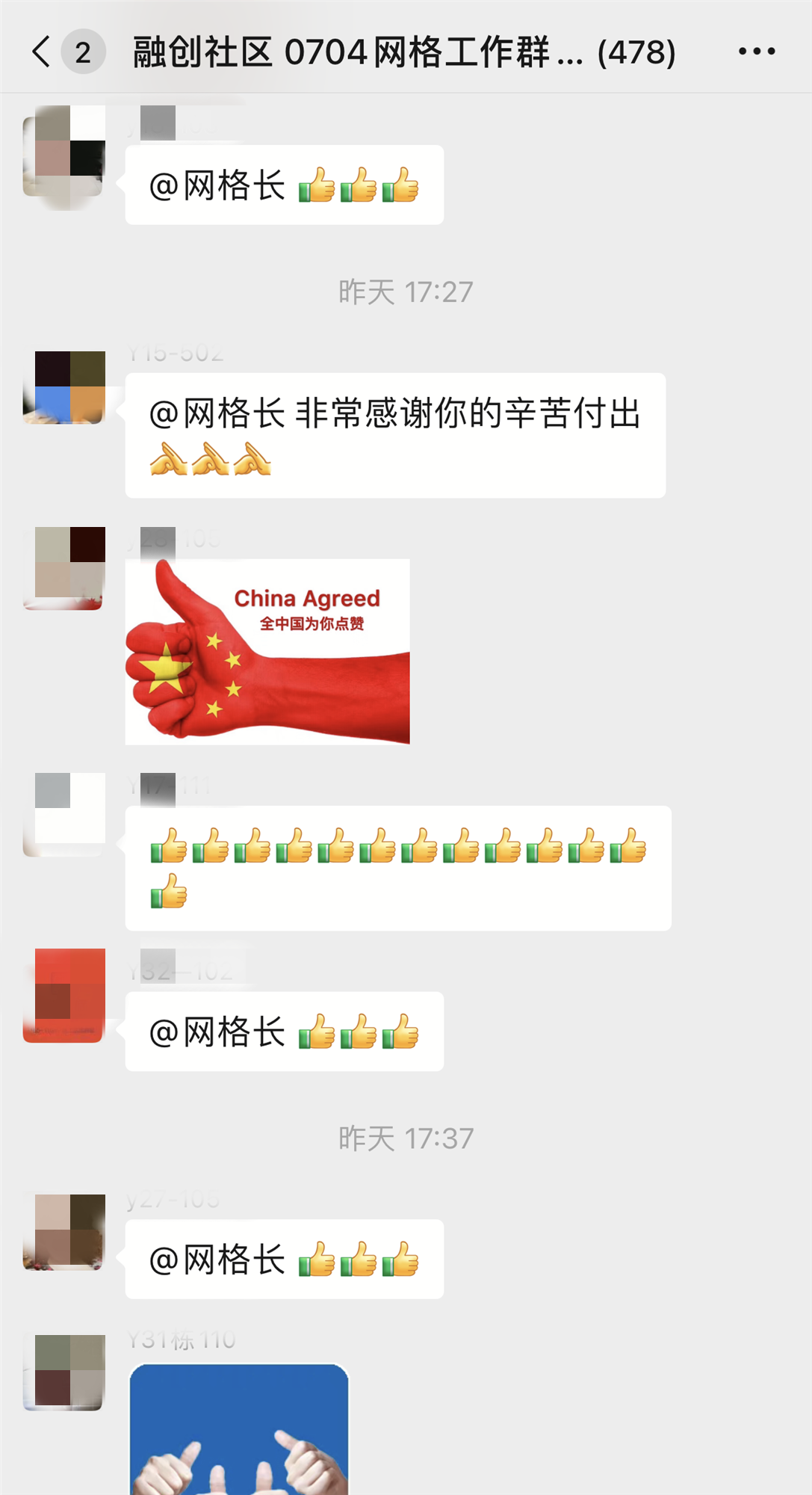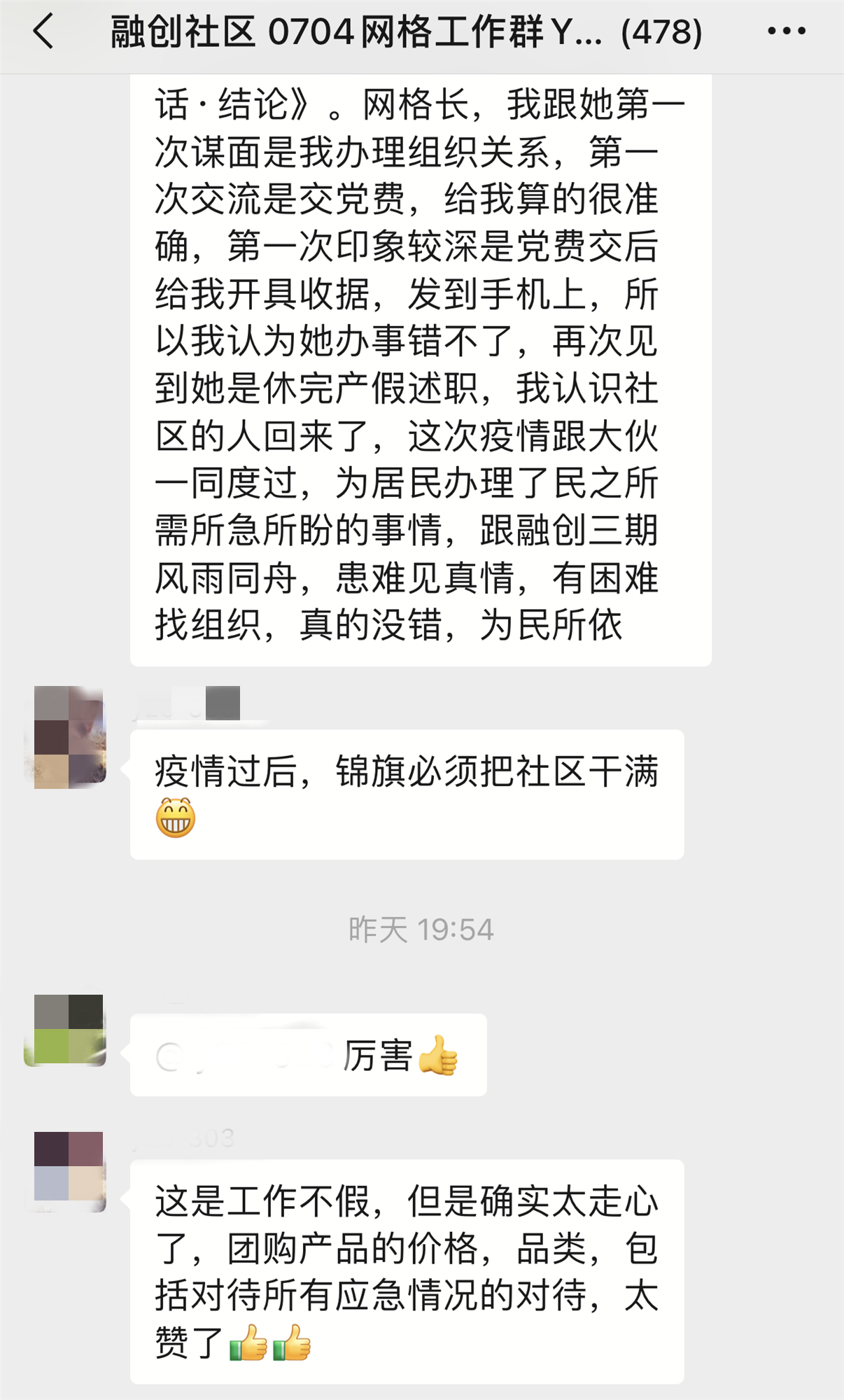 3月22日那天,她所在的网格里发现了一例确诊病例。刻不容缓,封控与保障同时进行。“我连夜单独给这栋楼的所有居民建立了一个小群,将封控的消息告知居民了。”同时也为居民们吃下一颗定心丸,“我在群里承诺,我是网格长,有任何需求就找我。”