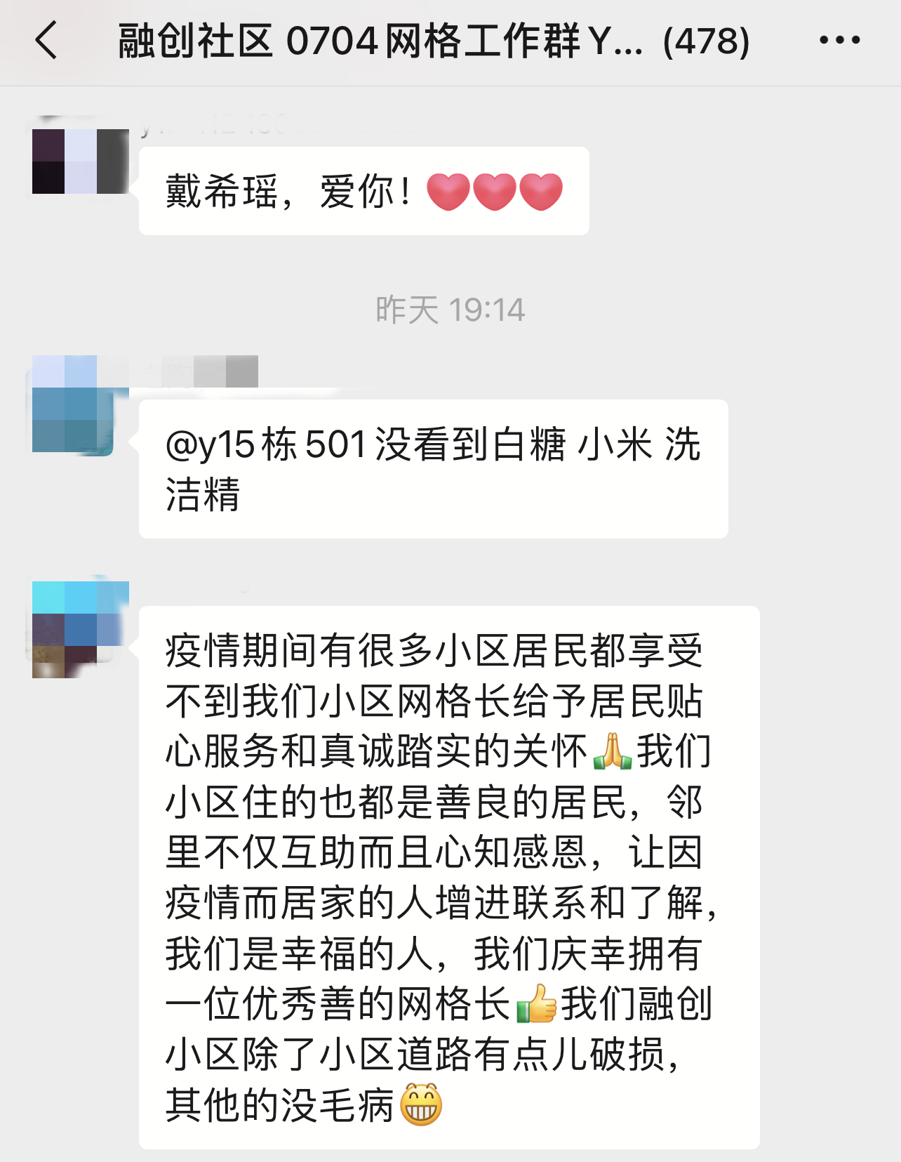 从三月中旬起,戴希瑶就一直住在社区里,每天睁开眼睛第一件事就是赶紧看看群里,别错过居民们的需求。“我们现在24小时待命,晚上手机不关机,有事儿就及时处理。”戴希瑶说。就这样,坚守一线40多天,没有一天休息。