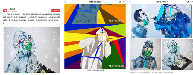 吉艺学生因疫情未能返校,在他的事迹号召下,有的学生们也加入到了自己家乡的抗疫志愿服务中来。都说艺术源于生活,王星儒老师在带领学生们进行志愿服务的同时,还组织学生们创作抗疫主题作品,让学生们将自己居家的烦闷转化成专业创作,与学生们共同投稿,为“逆行者”记录瞬间。在他和学生们的努力下,他与学生们的作品也不断地被各个线上平台进行转载。