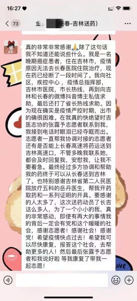 金女士收到药物泪流满面,她给所有帮助她的爱心人士写了一封长长的感谢信,信中说:“这次送药动员了长吉这么多人,为了一个小小的我,真的非常感动,即使有再大的事情我的背后一定会有党和这个暖暖的社会,感谢志愿者!感谢社会!感谢党!希望疫情快点过去!希望我可以尽快康复,报答这个社会,去帮助更多的人!”