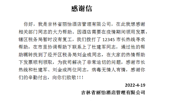 近日,吉林省丽怡酒店管理有限公司将一封电子信传到了长春经开区税务局,对该局在疫情期间积极提供“同城通办”服务,有效解决其发票紧缺难题的做法表达了衷心感谢。