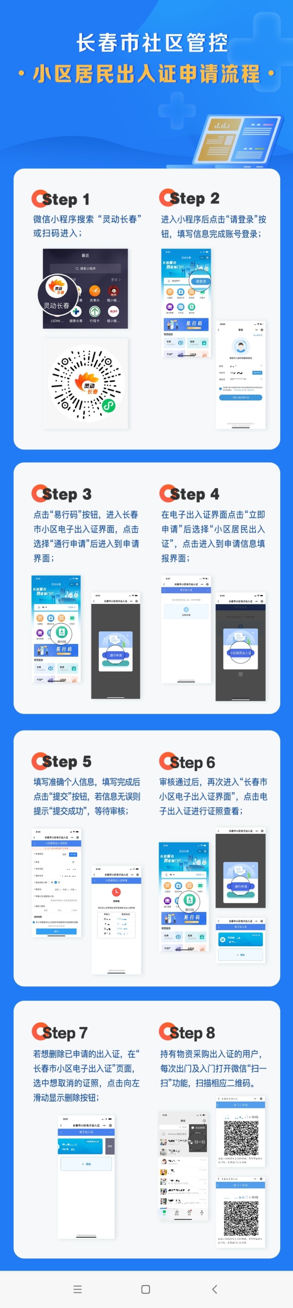 居民可以通过微信添加“灵动长春”小程序,点开“易行码”按“通行申请”流程填报,经小区管理员审核通过后即可生成电子出入证。