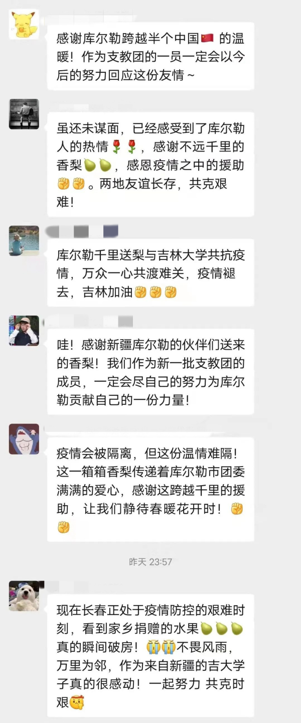 在吉林省本轮新冠肺炎疫情发生以来,吉林大学于3月13日启动了应急封闭管理方案,目前已取得阶段性胜利,形势正向好发展。在学校疫情防控任务繁重的紧要关头,库尔勒市团委心系校园和战疫前线师生的安危,捐赠库尔勒香梨300余箱,跨越4000公里奔赴而来,为做好疫情防控和安全稳定工作提供了重要保障,坚定了学校早日打赢疫情防控阻击战的信心。