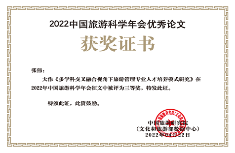 4月21-23日,由中国旅游研究院主办的2022年中国旅游科学年会在京召开。本届年会以“旅游人才建设与青年人才培养”为主题,探讨新阶段背景下学科建设与旅游人才培养。此次会议向全国征集论文104篇,经过多轮评审,有21篇论文被遴选为优秀会议论文。长春大学旅游学院旅游文化学院教师张伟撰写的论文《多学科交叉融合视角下旅游管理专业人才培养模式研究》获得三等奖,并受邀在会上作汇报交流。此项殊荣是该校教师在中国旅游科学年会上首次获奖。
