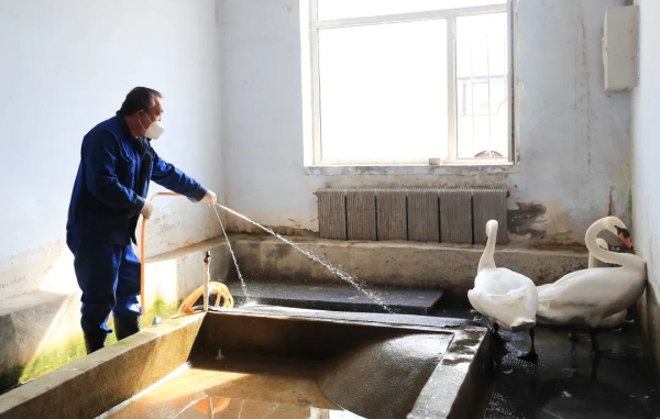 在漫长的冬天里,有“爸爸”“妈妈”们每天按时打扫圈舍、食槽和水槽,保证饲养区域的卫生清洁。