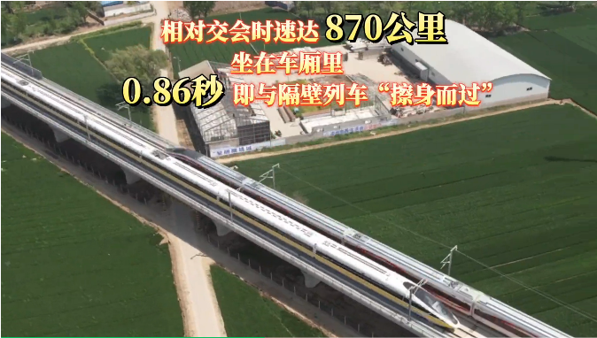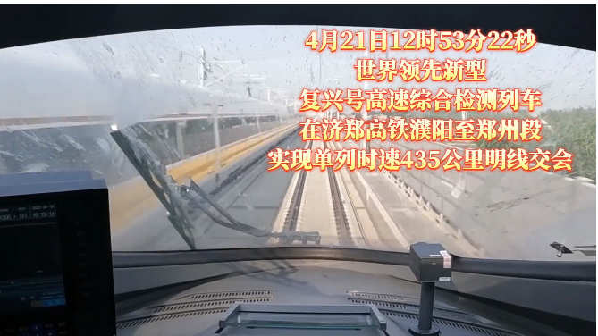 事情是这样:日前,由中国国家铁路集团有限公司组织、中车长客股份公司实施研制的世界领先新型复兴号高速综合检测列车上线运行。该车作为高速动车组新技术验证平台参与CR450动车组研制先期试验,4月12日,在郑州至重庆高速铁路巴东至万州段成功实现隧道内单列时速403公里、相对交会时速达806公里;4月21日,在济南至郑州高铁濮阳至郑州段成功实现明线上单列时速435公里、相对交会时速达870公里,创造了高铁动车组列车明线和隧道交会速度世界纪录。