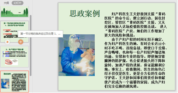 各个课程组积极建设课程思政案例库,通过与教学内容紧密融合的案例分享,引发学生的思考。《正常分娩》课程组引入妇产科医生王天舒支援“黄码医院”的案例,使学生对“无私奉献”和“抗疫精神”等有更直观的认识、更深刻地领悟。《儿科护理》课程组在讲授新生儿与新生儿疾病患儿护理时,引入林巧稚首创换血疗法拯救新生儿溶血病的案例,既体现了林巧稚医生善于钻研、勇于创新、有担当的精神,又体现了她的无私无畏与仁爱之心。