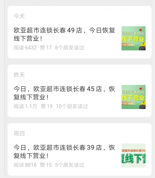 39店、45店、49店,欧亚超市连锁,每天都在增加恢复线下营业店面的数量。