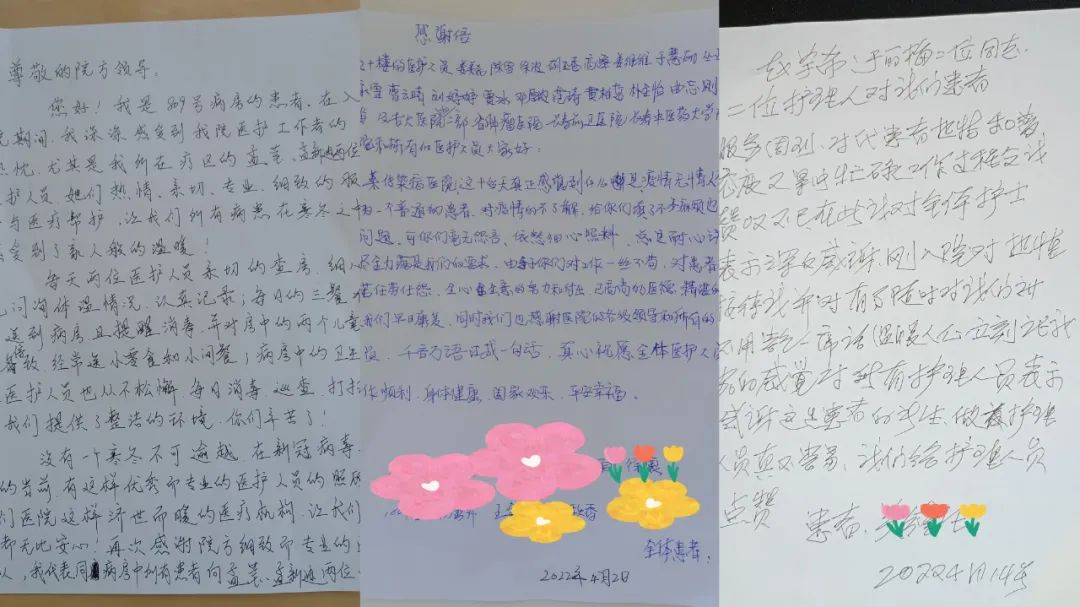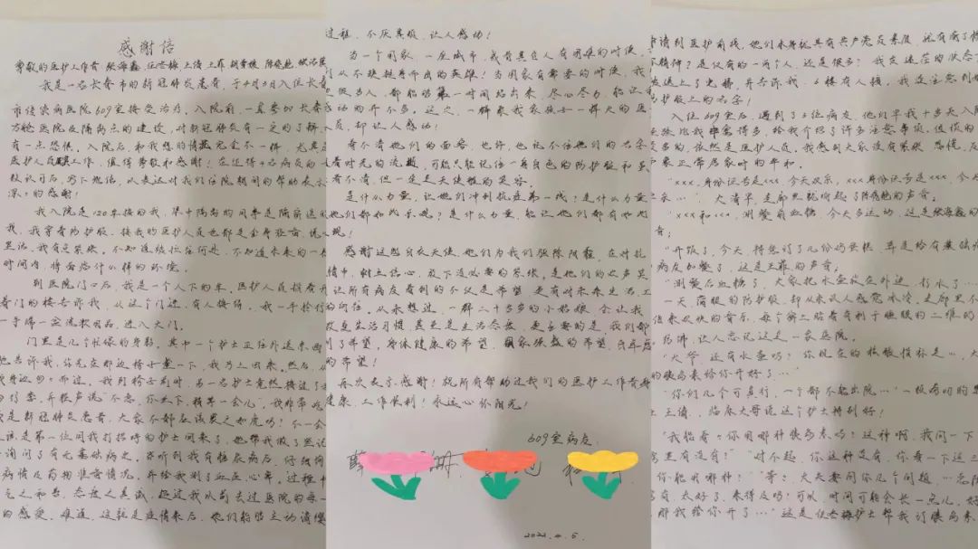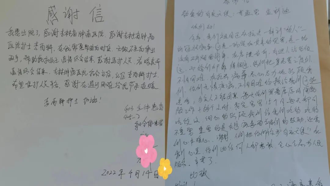 大疫如镜,照见白衣天使的无私和尽职。广大医务工作者夜以继日,连续奋战在抗击疫情第一线,用血肉之躯筑起了一座座“战斗堡垒”。他们“甘于奉献、大爱无疆”的精神不断激励着患者重燃希望。同样,患者们也将自己最真诚、善良、朴素的一面回报给一线的队员们,他们积极的配合治疗、担任志愿者、组织“广场舞”……并将全部的感谢凝结在这一封封感谢信上。