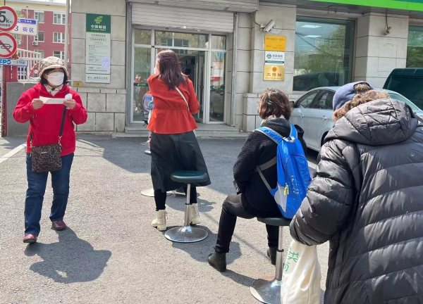 每家银行的门口,都要以老年人为主的市民在排队,几家银行均在门口放置了一排凳子,供市民排队的时候休息。由于避免银行大厅里发生聚集,几家银行网点都采取了每个窗口仅允许一位市民进入办理的形式,其他市民均外排队。中国银行和工商银行的门口有两位工作人员在忙碌,一位工作人员提醒大家保持距离,并解答一些市民的疑惑,另外一位工作人员站在门口提示市民业务办理的进程。中国邮政储蓄银行门口只有一位工作人员在忙碌,负责维持秩序、解答问题以及“叫号”。每个银行网点的排队时间都在半小时以上。