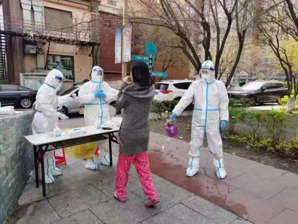 石岐(右一)在经开区临河街道临河社区第八网格协助核酸检测工作