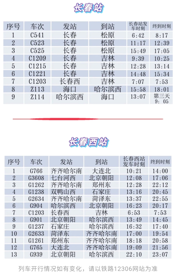 目前长春站、长春西站开行以下列车。