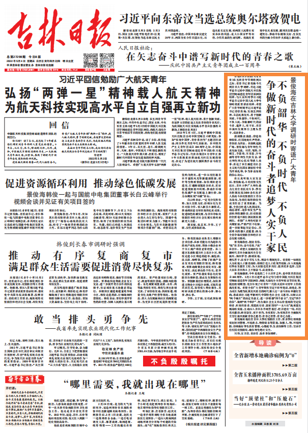 据《吉林日报》报道,5月3日,省委书记景俊海到吉林大学调研时强调,希望全省广大青年聚焦坚定不移听党话、跟党走,努力成长为堪当民族复兴重任的时代新人这一奋斗目标和前行方向,忠诚践行习近平新时代中国特色社会主义思想,深刻认识“两个确立”的决定性意义,进一步增强“四个意识”、坚定“四个自信”、做到“两个维护”,努力做社会主义核心价值观的坚定信仰者、积极传播者、模范践行者,紧密围绕“一主六双”高质量发展战略实施,主动深入吉林条件艰苦基层、经济建设一线、科技攻关前沿,踔厉奋发、实干担当、务实重行,为实现吉林全面振兴全方位振兴贡献青春之思想、青春之智慧、青春之力量。
