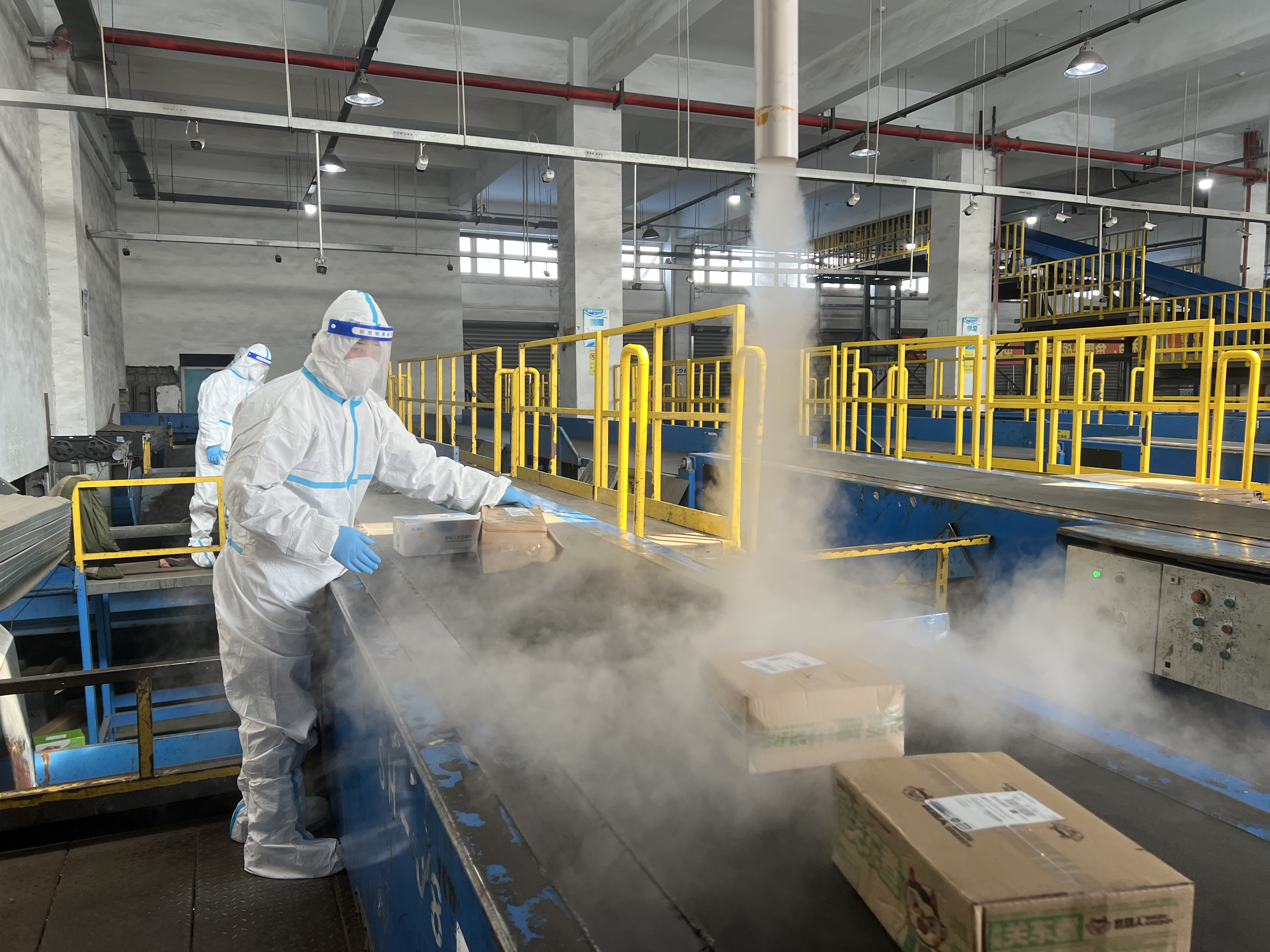 在申通快递转运中心,数十名业务员戴着口罩、穿着防护服忙碌地工作。物流货车刚停泊在货仓区,工作人员就迅速把商品送到运输带,通过扫码、分派等程序后,将市内各社区和各乡镇快件按区域摆放,再由相关负责业务员进一步确认,并进行消毒后才进行分发。