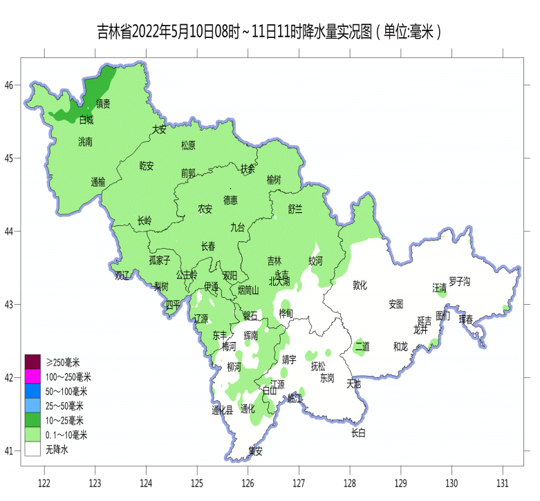 截至11日11时,全省平均降水量1.7毫米,地区分布:白城6.0毫米,松原3.6毫米,长春2.9毫米,吉林1.4毫米,四平1.3毫米,辽源0.5毫米,通化0.1毫米,其他地区基本无降水。共出现19站中雨。降水量前十位:白城永红村14.2毫米,洮南福顺镇13.1毫米,白城平安镇12.5毫米,扶余黄花村12.1毫米,镇赉坦途镇11.9毫米,白城平台镇光明村11.6毫米,洮南四平村11.3毫米,白城晓光村11.3毫米,白城方家村11.2毫米,白城镇南种羊场四间房11.0毫米。