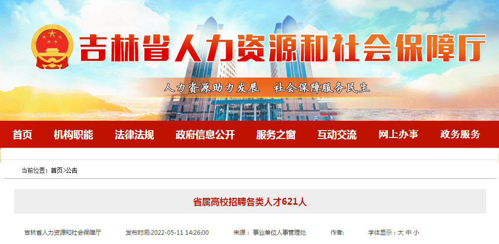 11日,中国吉林网从吉林省人力资源和社会保障厅了解到,省属高校招聘各类人才621人。