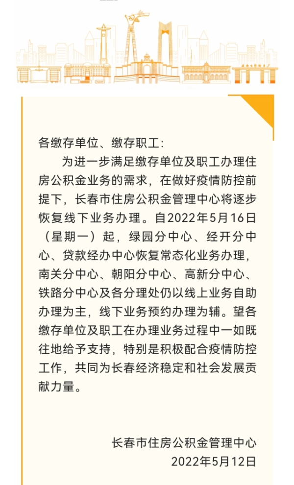 5月12日,中国吉林网获悉,为进一步满足缴存单位及职工办理住房公积金业务的需求,在做好疫情防控前提下,长春市住房公积金管理中心将逐步恢复线下业务办理。
