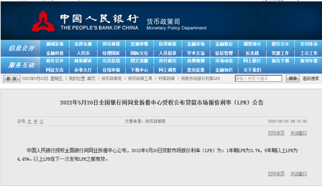 中国吉林网注意到,中国人民银行授权全国银行间同业拆借中心公布,2022年5月20日贷款市场报价利率(LPR)为:1年期LPR为3.7%,5年期以上LPR为4.45%。这是自今年1月20日后,5年期以上LPR再次下调。