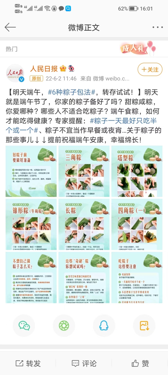 明天就是端午节了,您家的粽子备好了吗?端午食粽,如何才能吃得健康?这不,《人民日报》的一则关于“如何吃粽子”的微博冲上了热搜:专家提醒:#粽子一天最好只吃半个或一个#、粽子不宜当作早餐或夜宵……