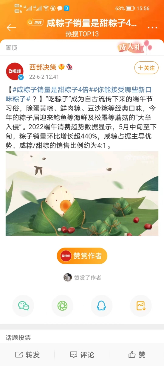 当然,网络间关于粽子的讨论也不少,其中很有趣的一条就是您喜欢吃甜的粽子还是咸的。您还不知道吧,2022端午消费趋势数据显示,5月中旬至下旬,粽子销量环比增长超440%,咸粽占据主导优势,咸粽/甜粽的销售比例约为4:1。
