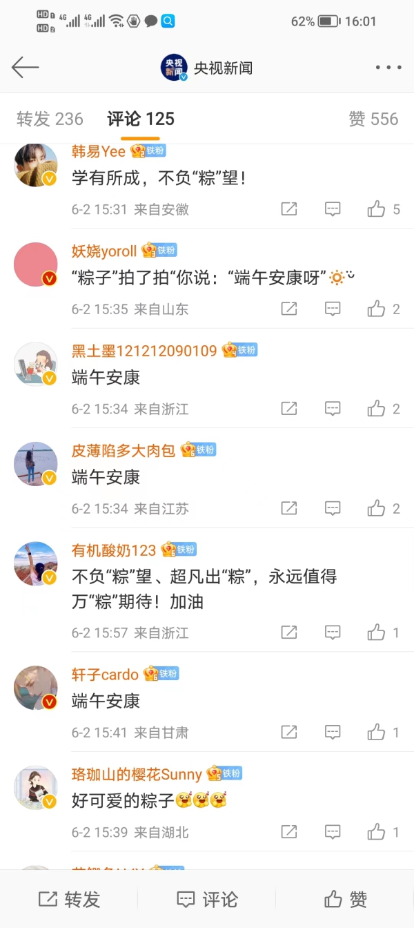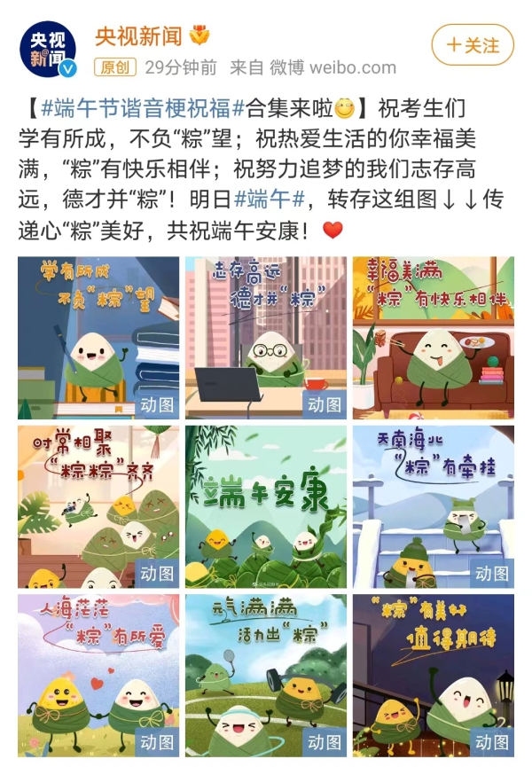 对于很多即将参加高考的学子而言,这个端午节注定不会“轻松”,毕竟,端午假期过后,他们就要迎来高考了。央视新闻推出了《#端午节谐音梗祝福#合集来啦[笑而不语]》的微博,为即将参加高考的考生们送上祝福: